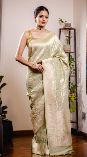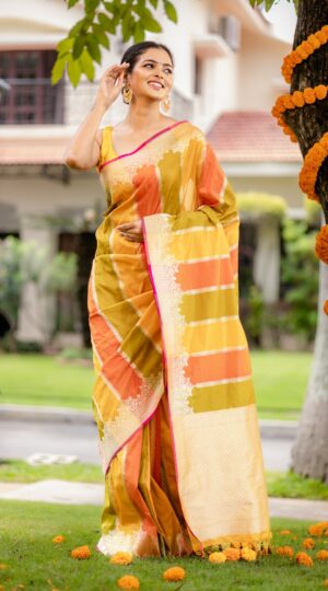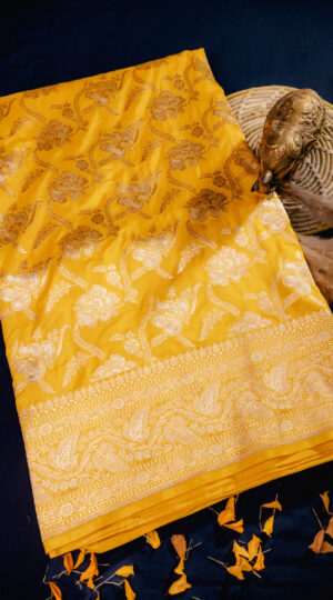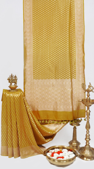 Pure Kora Silk Banarasi Handloom Saree In Shades Of Yellow