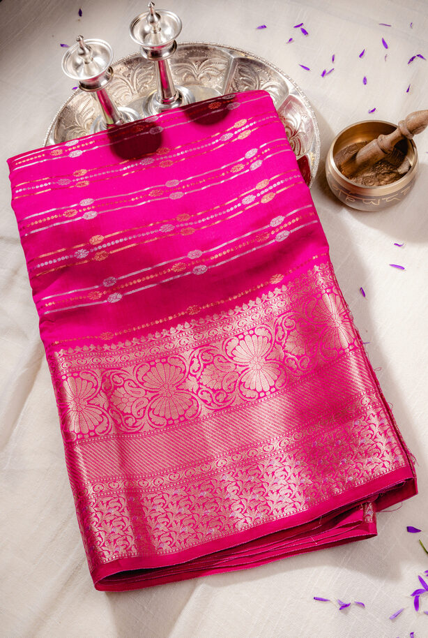 Elevate your wardrobe with this stunning pink silk sari adorned with intricate silver and gold designs. This saree will surely make perfect choice for any special occasion. The Saree Includes Unstitched Blouse.