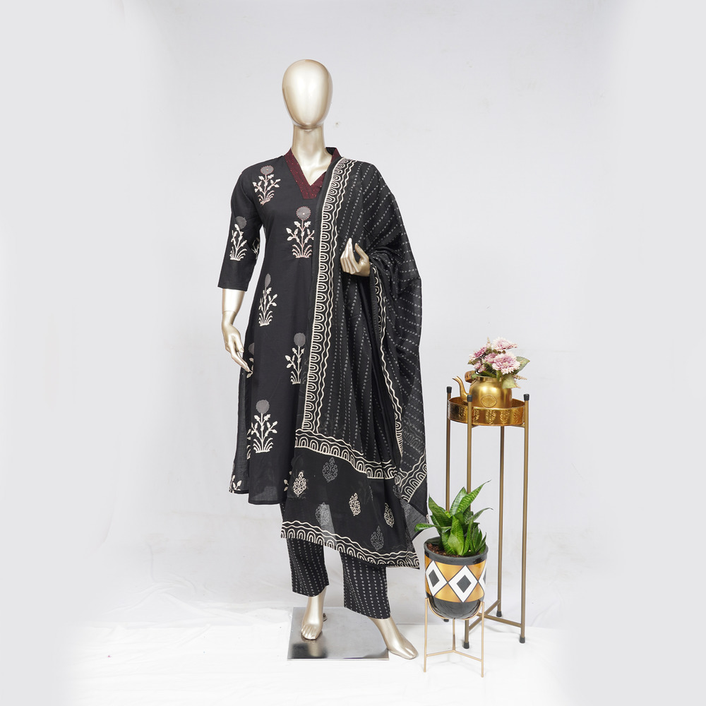 Black Mulmul Handblock Printed Kurta Set With Dupatta