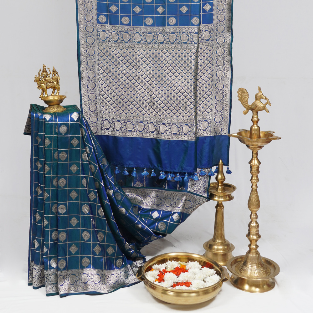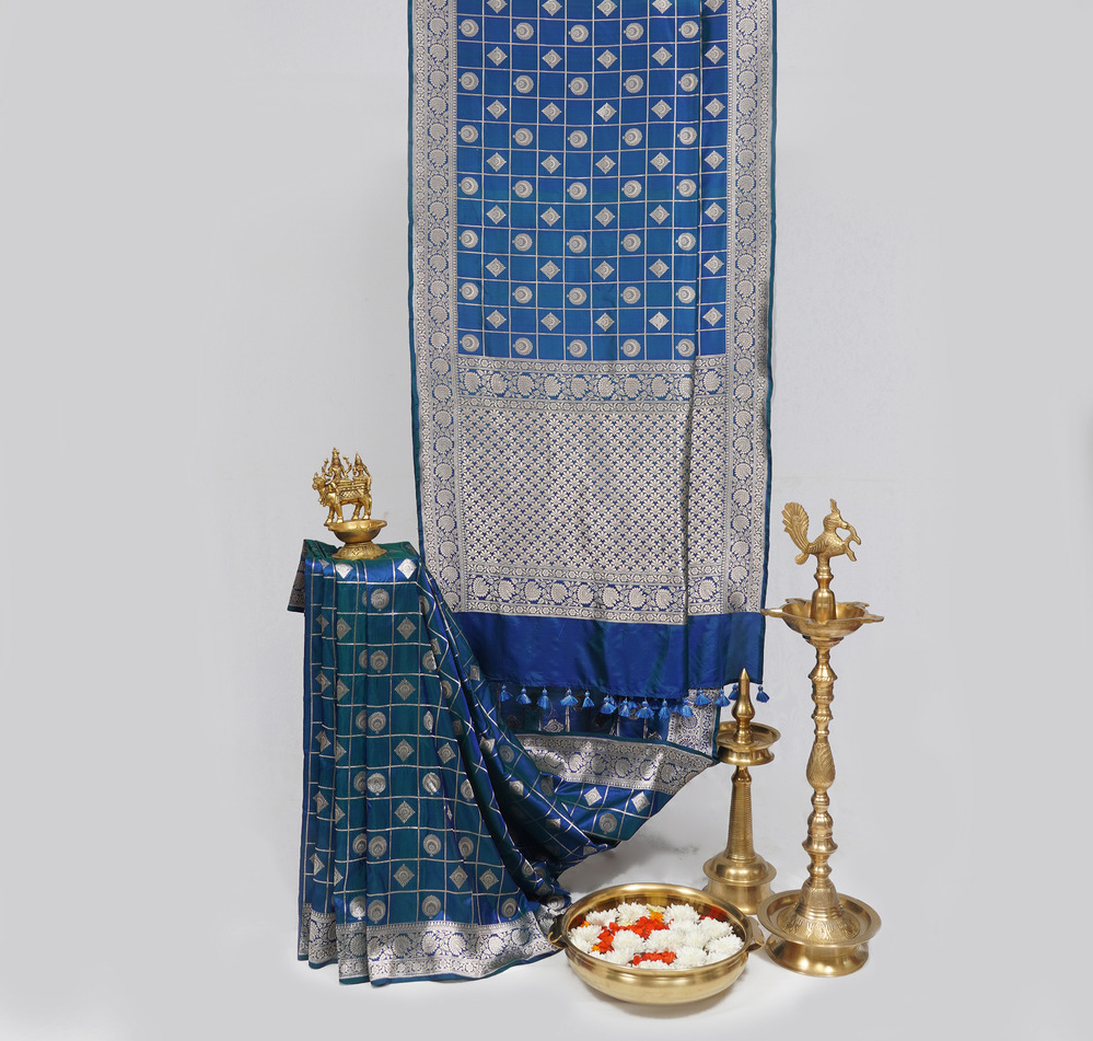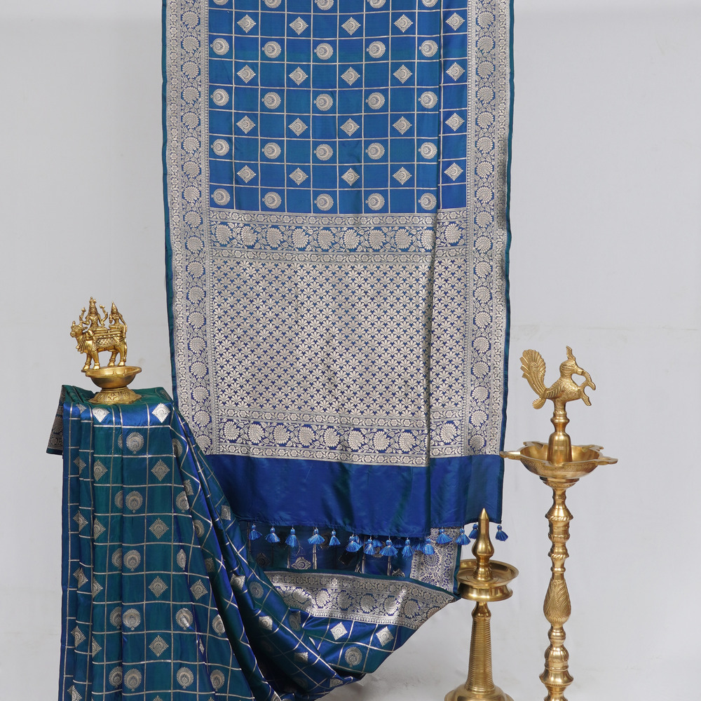 It’s A Classic Traditional Banarasi Saree In A Peacock Blue Colour With Checks And Motifs All Over The Body, Perfect For Super Comfortable Vintage Look. The Saree Includes Unstitched Blouse.