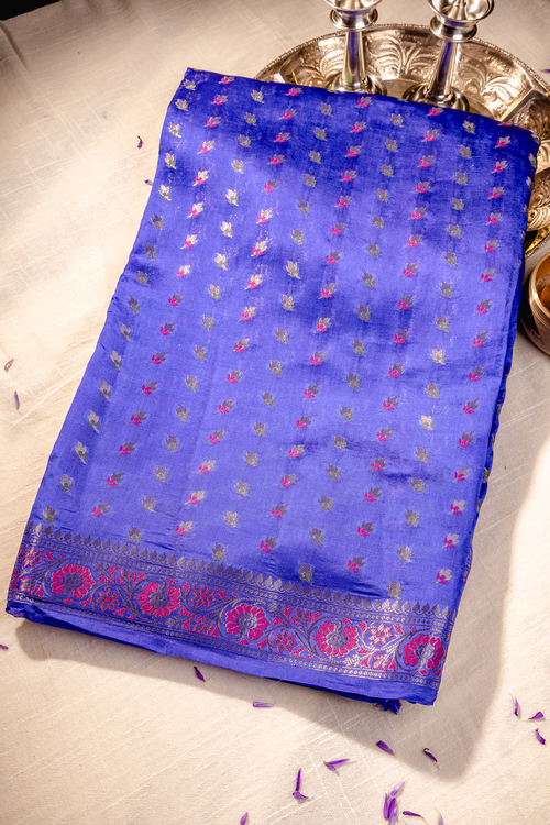 This vibrant blue color saree is perfect for any special occasion. The silver border with floral designs on it adds a touch of elegance. The Saree Includes Unstitched Blouse.