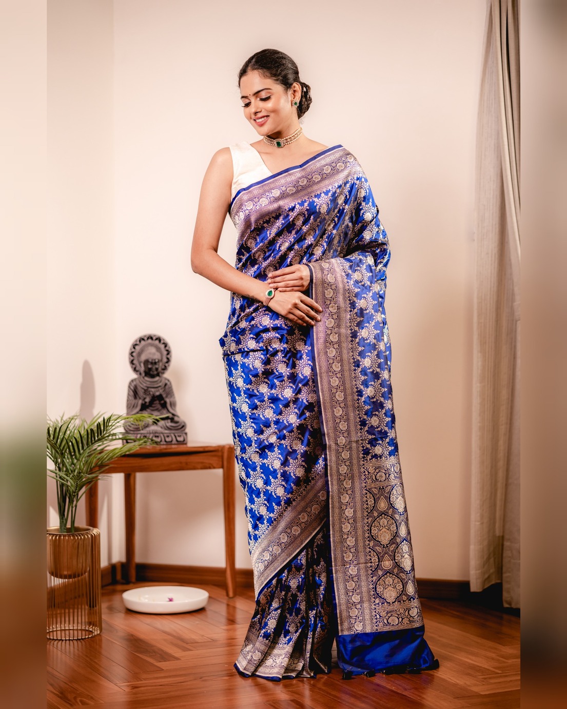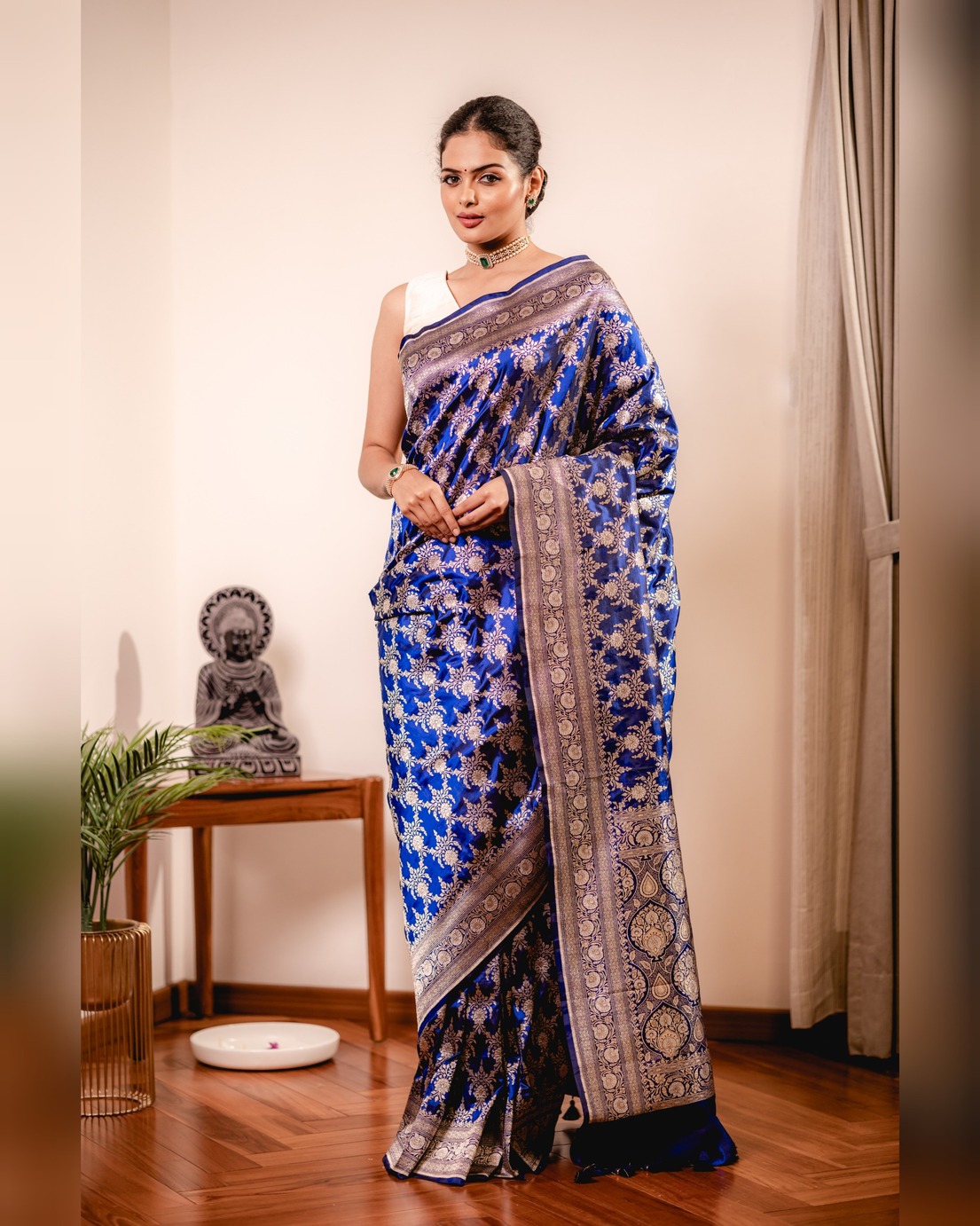 A Deep Blue Banarasi Saree Is A Striking Blend Of Elegance And Vibrancy. The Luxurious Katan Silk Fabric Enhances The Richness, While The Bold Deep Blue Hue Adds A Modern Twist. Intricate Zari Work And Traditional Motifs Make This Saree A Captivating Choice, Radiating Both Traditional Charm And Contemporary Allure. The Saree Comes With Beautiful Tassels And Unstitched Blouse