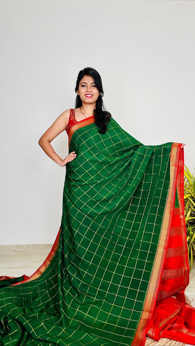 This green Mysore Silk saree is a testament to timeless elegance, featuring checks adorning its body. Paired with a contrast border, this saree exudes timeless sophistication and charm.