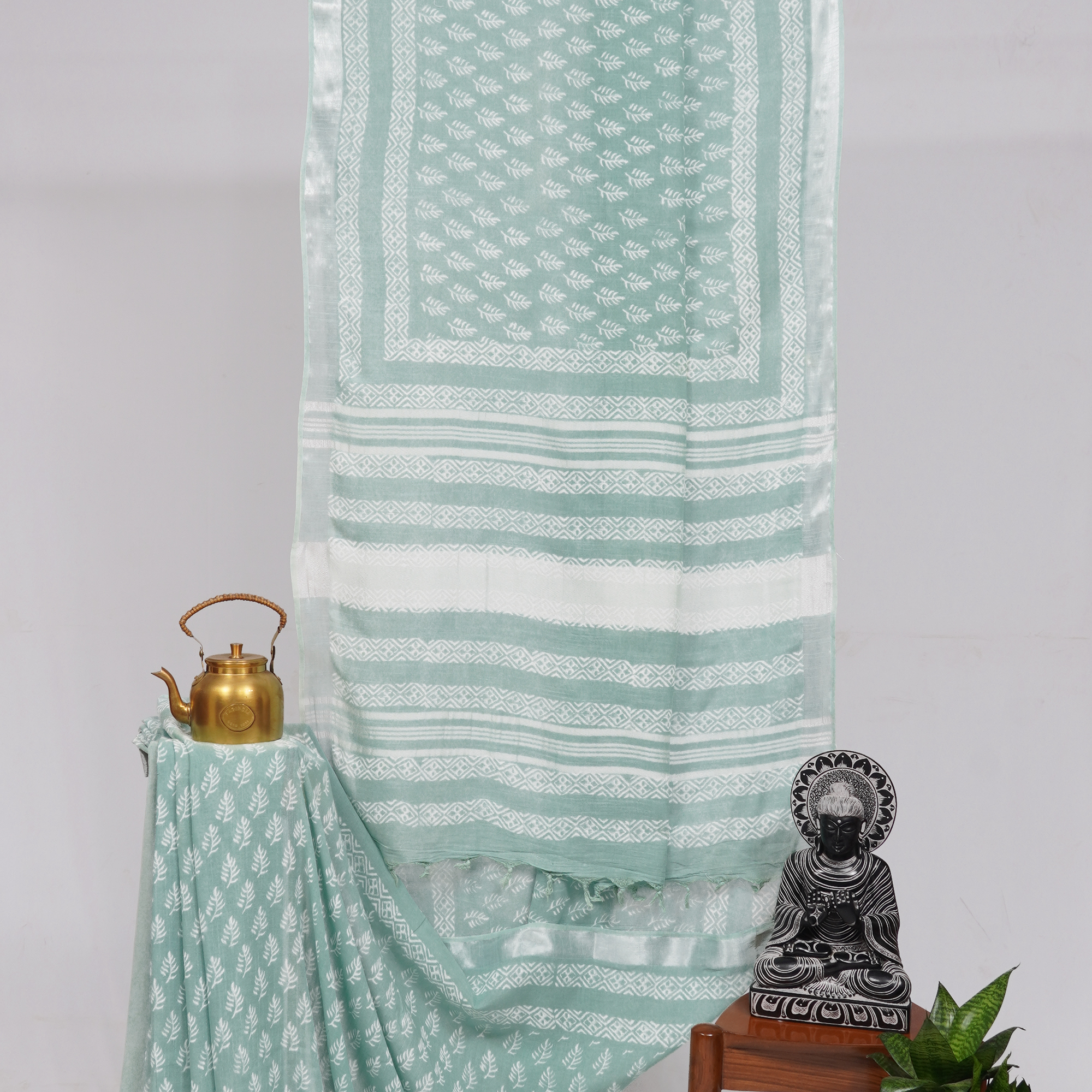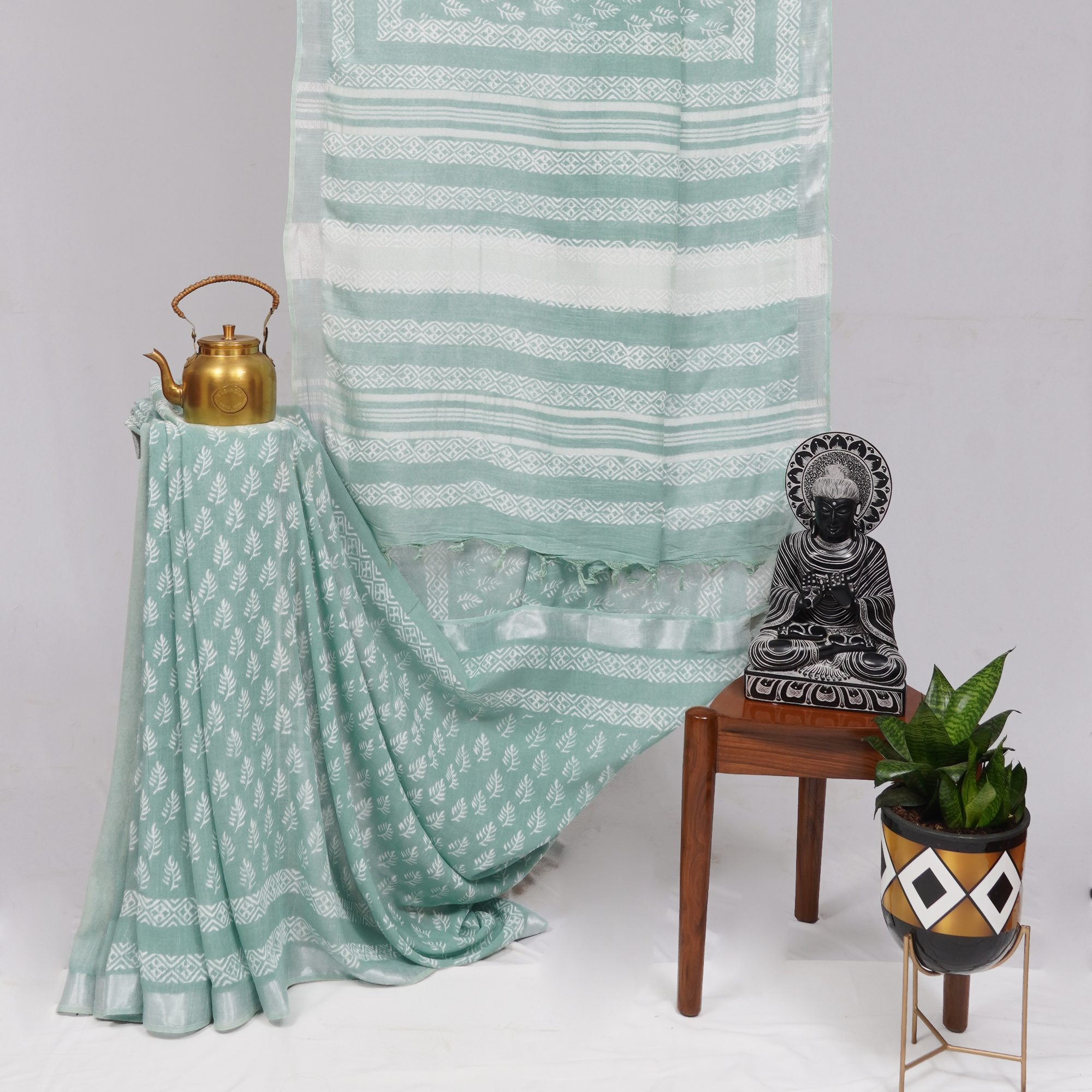 Pure Linen is known for its breathable and lightweight qualities. The block print bootas add a beautiful traditional flair, giving the saree a distinct character. Pairing it with a contrasting or complementary blouse in a solid color or subtle print, and some simple Silver Jewelry or a statement necklace can add elegance without overpowering the saree. The look is perfect for casual gatherings, festivals, or even day-to-day wear.