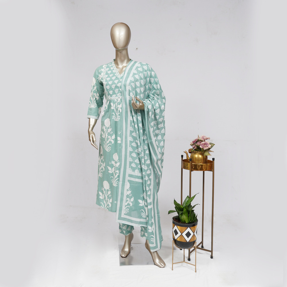 Pastel Green Handblock Printed Mulmul Cotton Kurta Set With Dupatta
