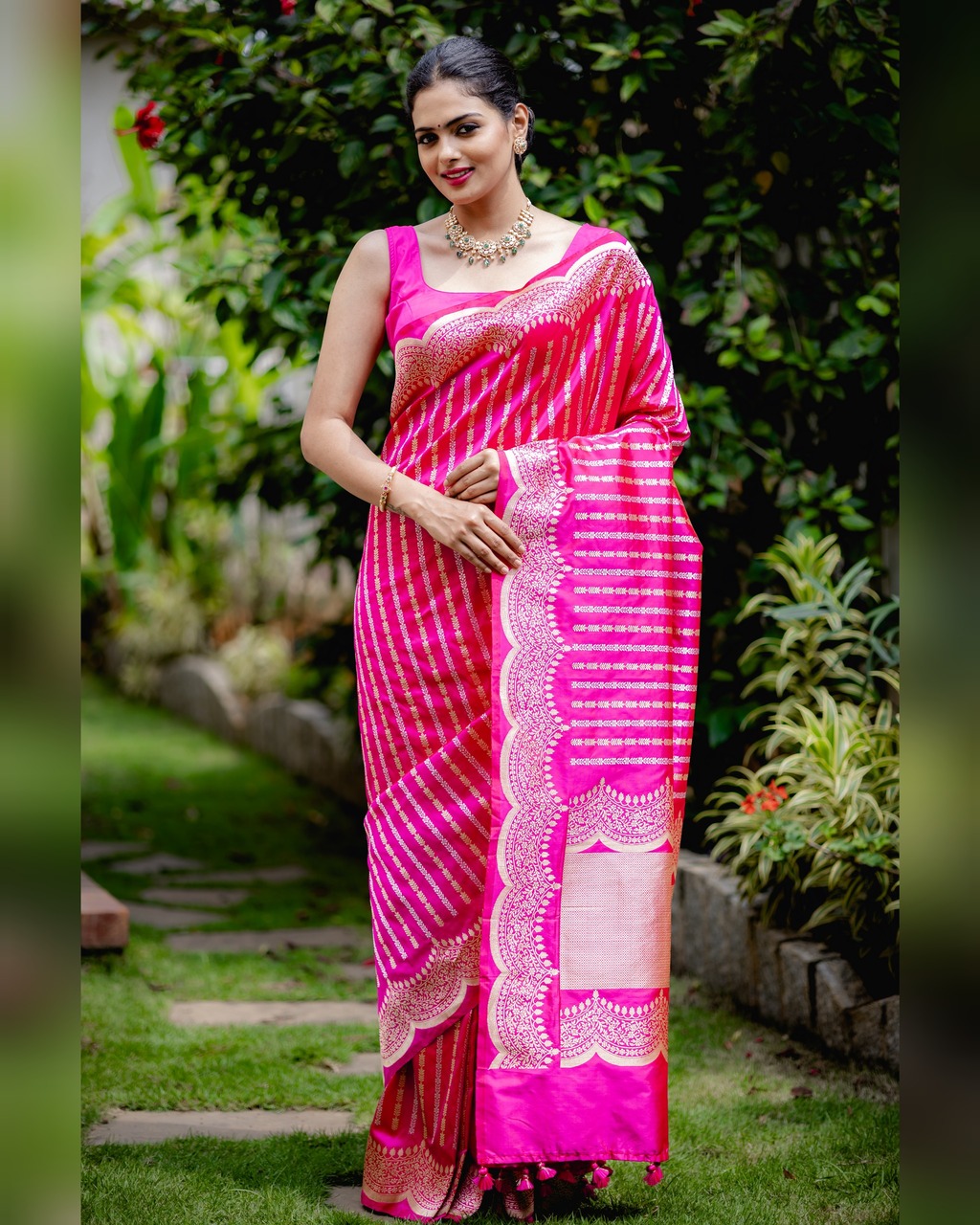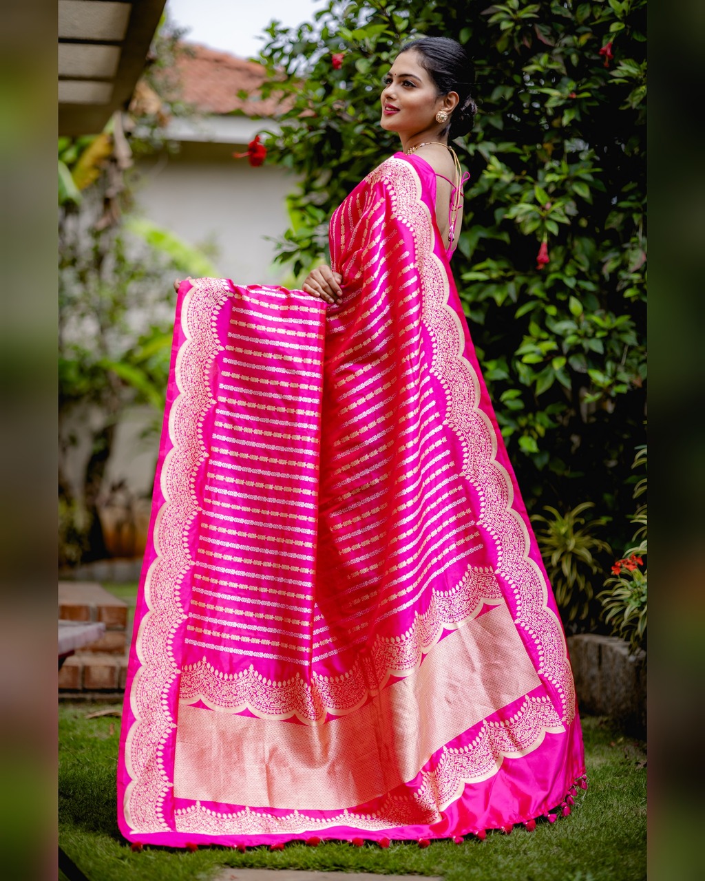 A royal banarasi saree in a gorgeous pink color adorned with beautifully placed Sona Rupa khadua stripes all over, edged with an intricate scalloped floral border. The Saree Comes With Beautiful Tassels And Unstitched Blouse.